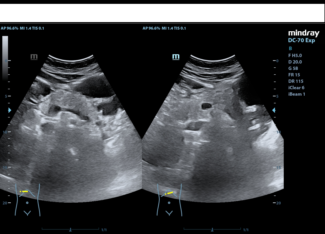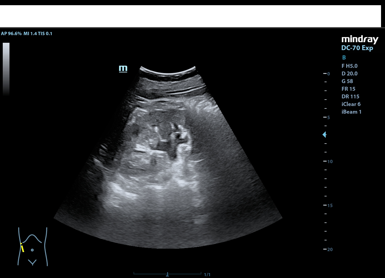 Sin antecedentes personales relavantes. Se solicita analítica y ecografía clínica en el centro de salud. La paciente acude a las 48 horas, refiriendo mejoría de la sintomatología. A la exploración, dolor en flanco y fosa renal izquierda, con puñopercusión ipsilateral positiva. En la analítica, elevación de los reactantes de fase aguda (ferritina 700, PCR 17, VSG 140). Ante estos hallazgos se decide realizar ecografía clínica.