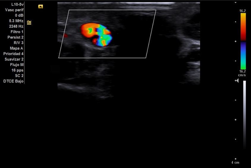 Secuencia doppler en la que podemos ver dos flujos en el interior de la lesión, dando lugar al conocido como signo del Yin Yang.