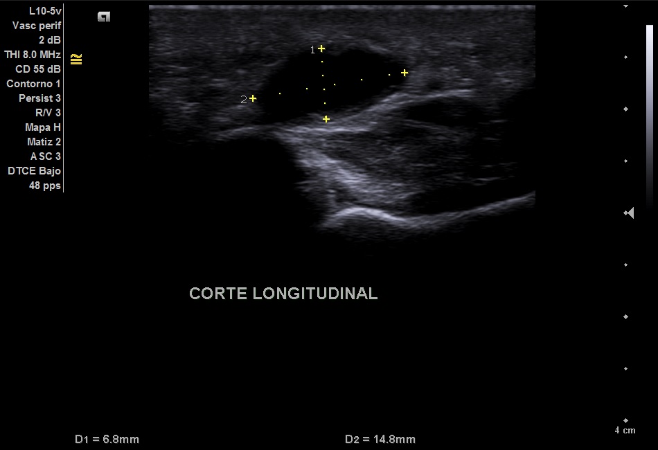 Imagen hipoecoica de 6,8 x 14,8 mm.