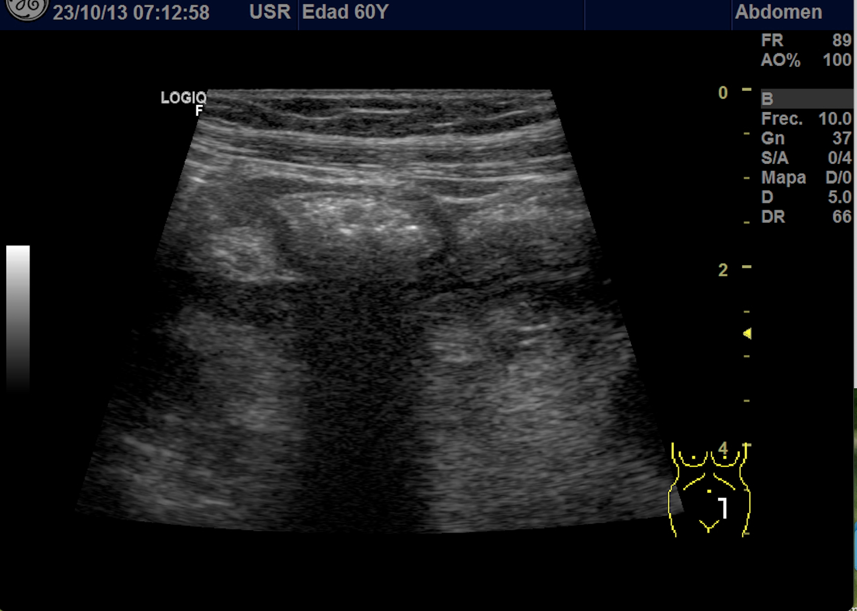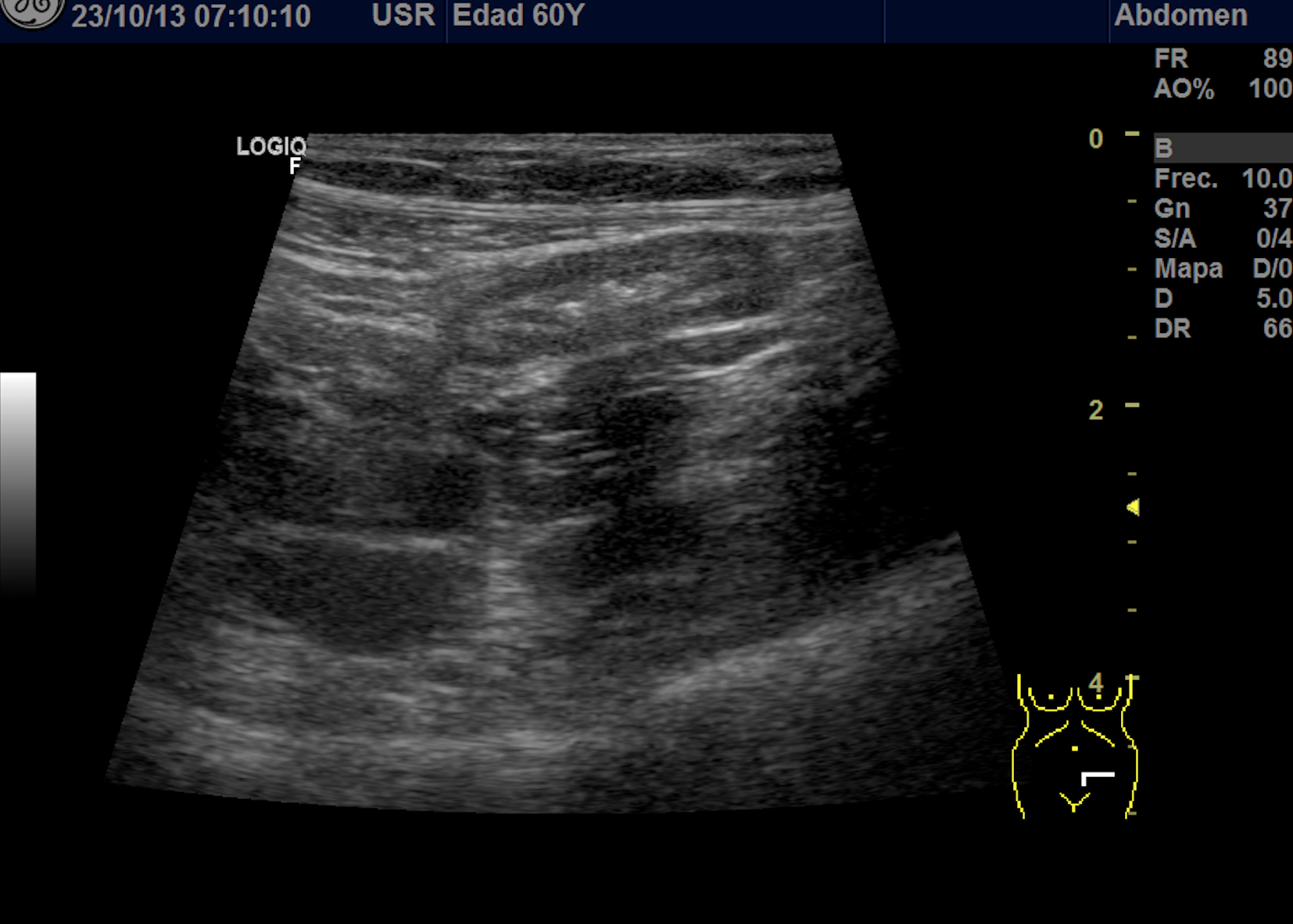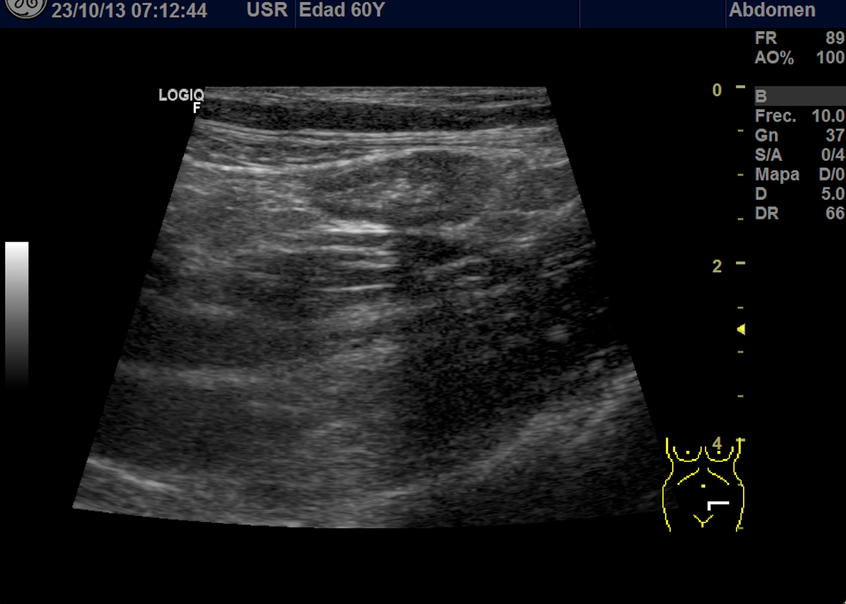 Mujer de 60 años, hipotiroidismo, ERGE bien controlada. Acude por dolor abdominal tipo cólico de 1 semana de evolucion en hipogastrio y fosa ilíaca izquierda con sensación de distensión abdominal y deposiciones blandas sin productos patológicos, no cuenta fiebre, no perdida de peso, no ha tenido episodios similares anteriormente. Exploracion no aspecto séptico, abdomen: blando, depresible, en FII presenta dolor a la palpación profunda sin una clara defensa. Dada la exploración decidimos realizar ecografía.