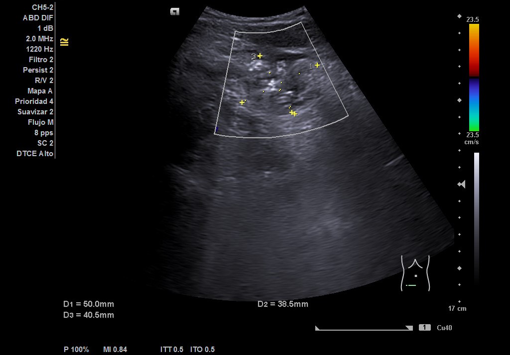 Hígado de tamaño, forma y ecoestructura conservadas, con parénquima homogéneo. Vena porta de calibre conservado. Ausencia de signos de dilatación de la vía intra o extrahepática. Vesícula biliar de paredes finas, sin contenido ecogénico en su interior. Páncreas de características normales. Riñones de tamaño y localización conservada, sin hidronefrosis. En FID imagen heterogénea delimitada, de 50x30 mm, con posible edema de pared y focos ecogénicos en su interior.Pruebas complementarias