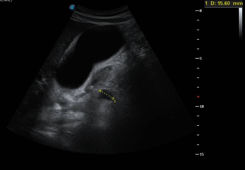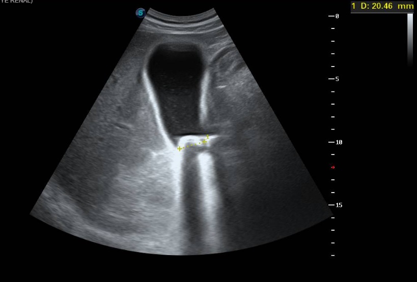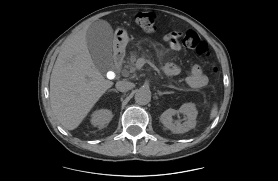 Ecografía clínica a pie de cama: Parénquima hepático y esplénico de ecoestructura preservada. Vesícula biliar marcadamente distendida con imagen hiperecogénica de 2 cm en porción declive compatible con litiasis. Dilatación de la vía biliar intrahepática difusa así como dilatación del colédoco.