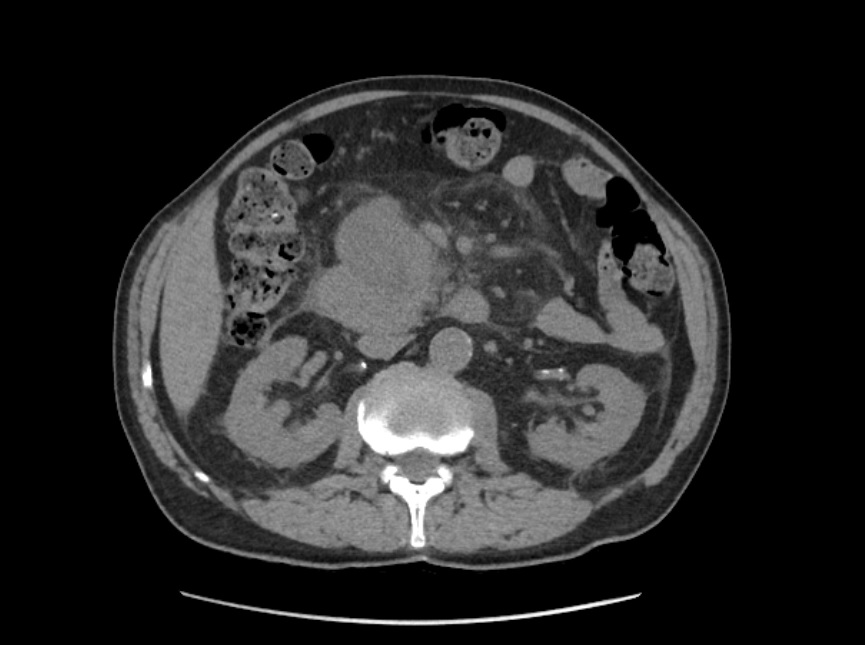 Hombre de 70 años, fumador de 5 cigarros/día, hipertensión en tratamiento. Acude a Urgencias por dolor epigástrico de 2 meses, irradiado hacia ambos hipocondrios y espalda, con reagudización en los últimos 20 días. No náuseas ni vómitos. Ritmo intestinal mantenido. No ictericia ni acolia, sí coluria. Astenia e hiporexia marcadas, pérdida de 2 kg en el último mes. No fiebre.